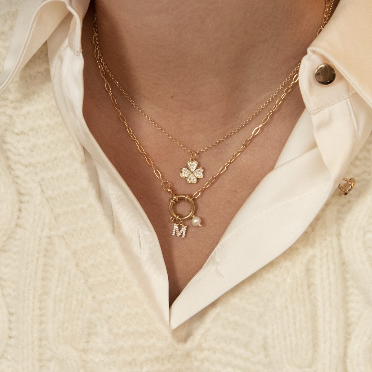 Incluye collar + charm letra circonitas blancas + charm perla cultivada en el cierre.