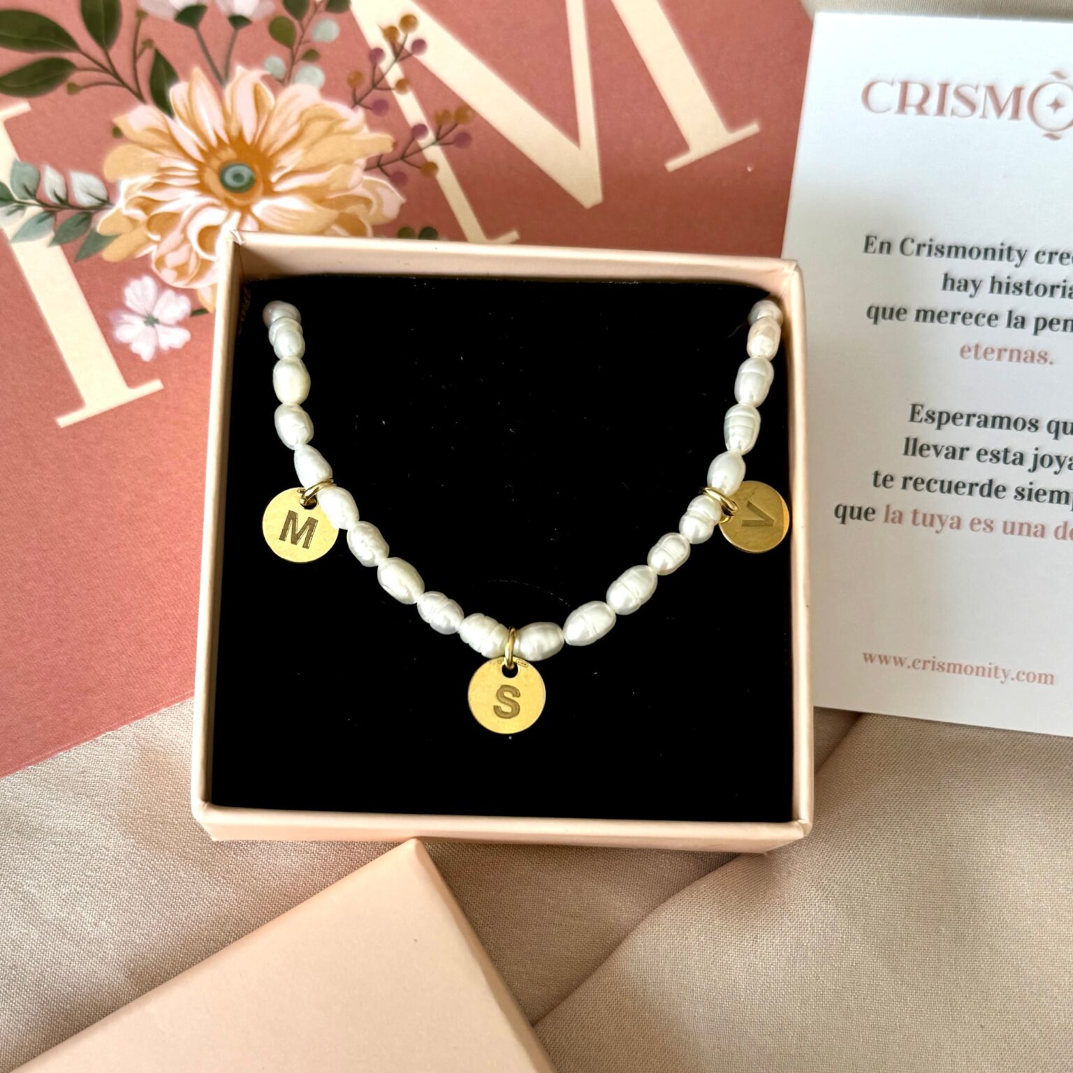 Gargantilla Perlas Letras Especiales Crismonity, realizada en plata de primera Ley 925 y plata bañadas en oro de 18 quilates. Perlas cultivadas montadas a mano una a una en nuestro taller.