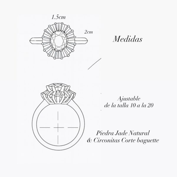 Una pieza elegante y única de esas que pasan de generación en generación con un diseño clásico pero en tendencia que llevarás siempre. Realizada en nuestro taller en plata de ley 925 con piedra central Jade Natural con piedras talla Baguette engarzadas en 4 garras rodeando a la principal.