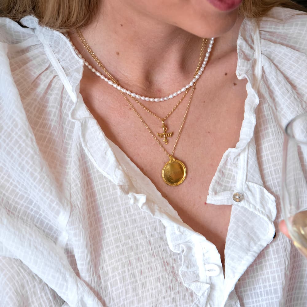 Una pieza única con perlas montadas una a una. Cierre en plata de primera Ley 925 y Plata chapada en oro 18K.