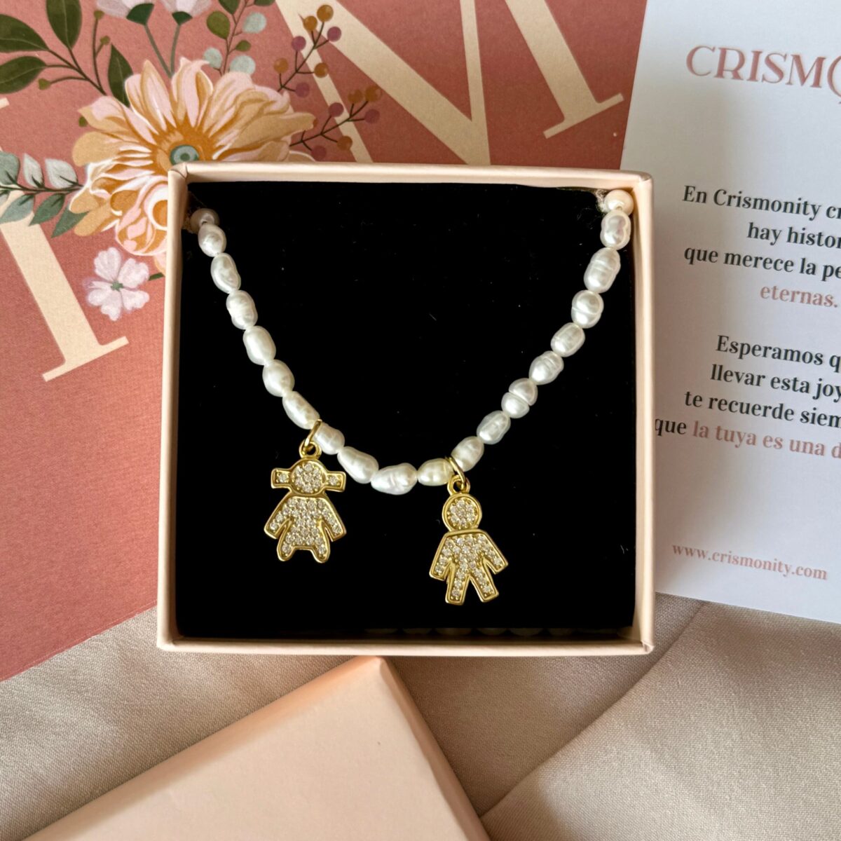 Collar Perlas cultivadas Niños Plata de primera ley chapada en oro de 18K con circonitas. Perlas cultivadas montadas a mano una a una en una pieza única con niños.