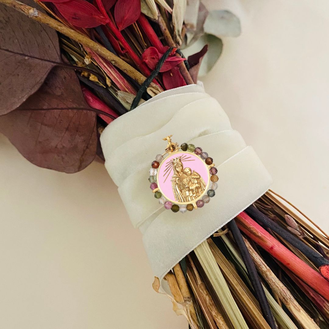 La Medalla de Novia Virgen del Carmen con piedras naturales amazonitas es lo más especial que puede llevar una novia el día de su boda.