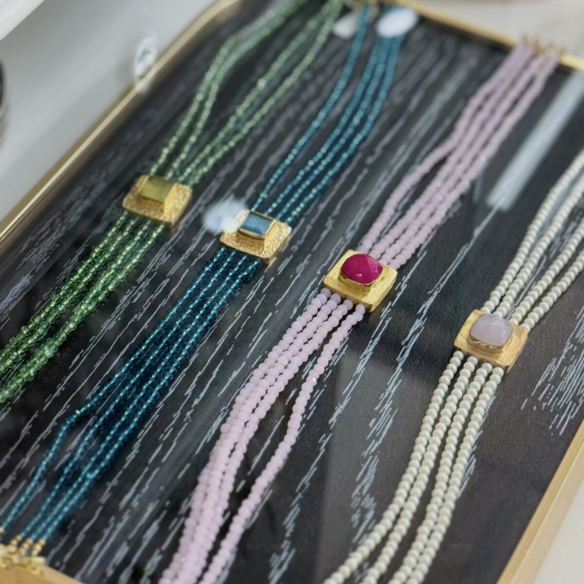 Choker Elegance Colores. Realizado a mano en hilo rígido de acero chapado en oro de 18K con piedras de colores.