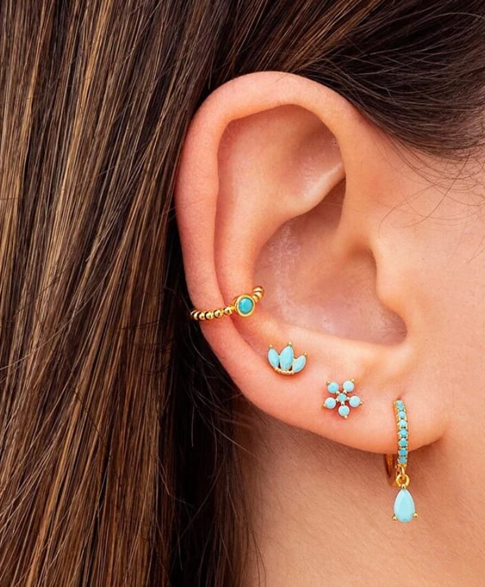 Earcuff Prai Turquesas , con un diseño exclusivo en plata de Primera Ley 925chapada en oro 18k con bolitas y circonita central turquesa. Una elección para sentirte especial y única con todos tus looks