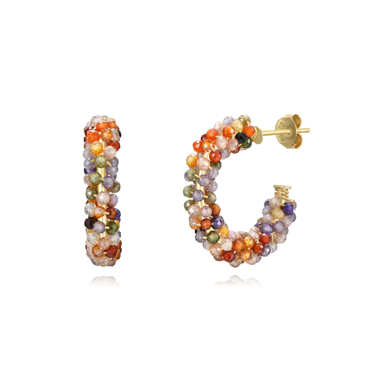 • Un par de pendientes minerales de semi aro fabricados en plata de ley 925 disponibles en acabado chapado en oro.