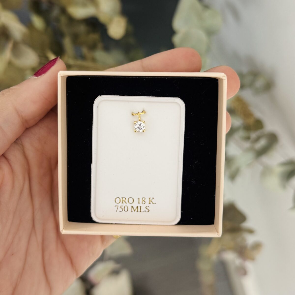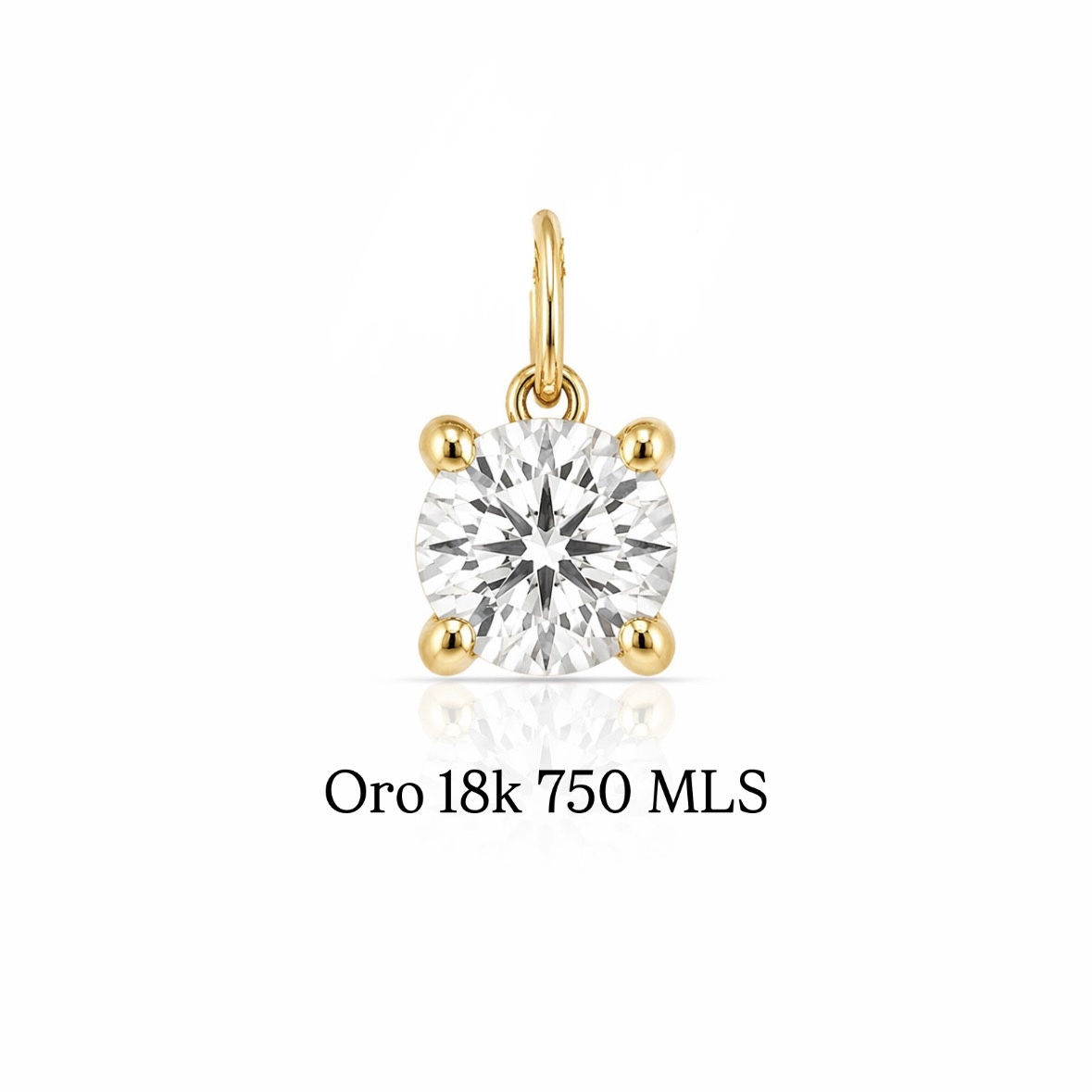 Colgante Punto de Luz oro 18k engarzado en 4 garras sobre una montura cuidadosamente realizada a mano en oro. Un diseño exclusivo y único que te hará brillar