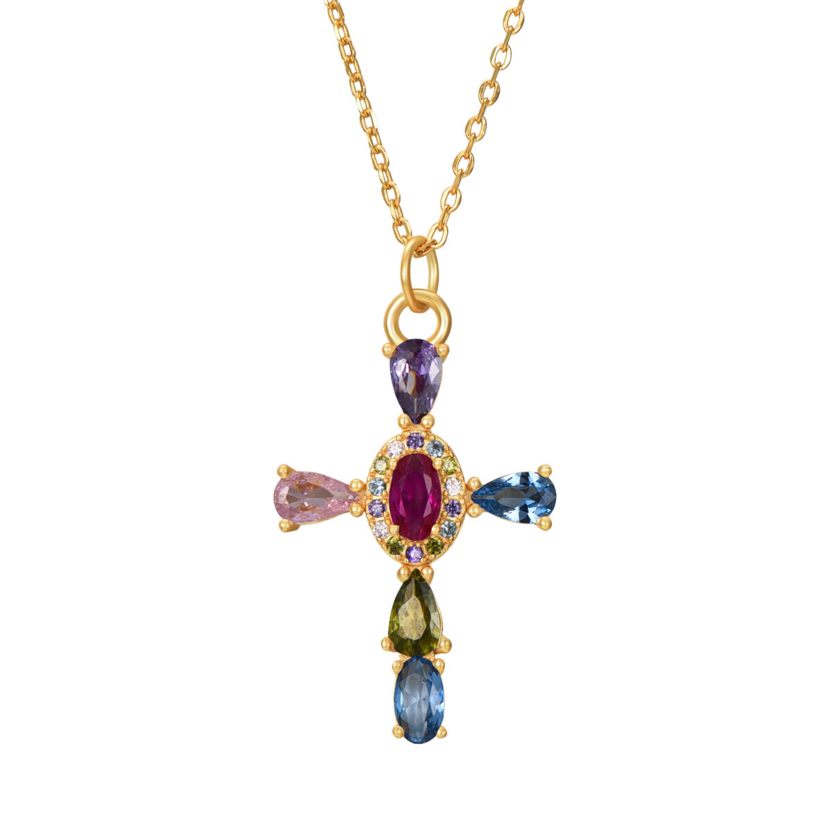 Cruz Elisabeth Plata 925 chapada en oro de 18k Circonitas colores, con un diseño exclusivo en plata de Primera Ley 925. Lleva tu joya Crismonity contigo, haz tu historia eterna.