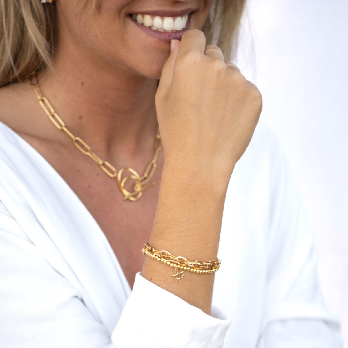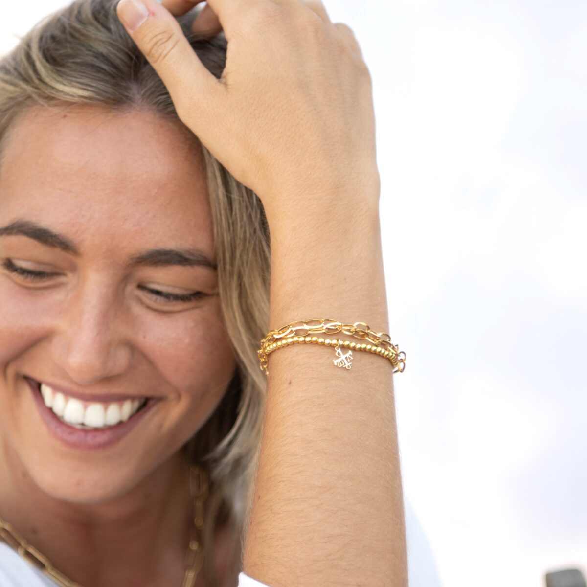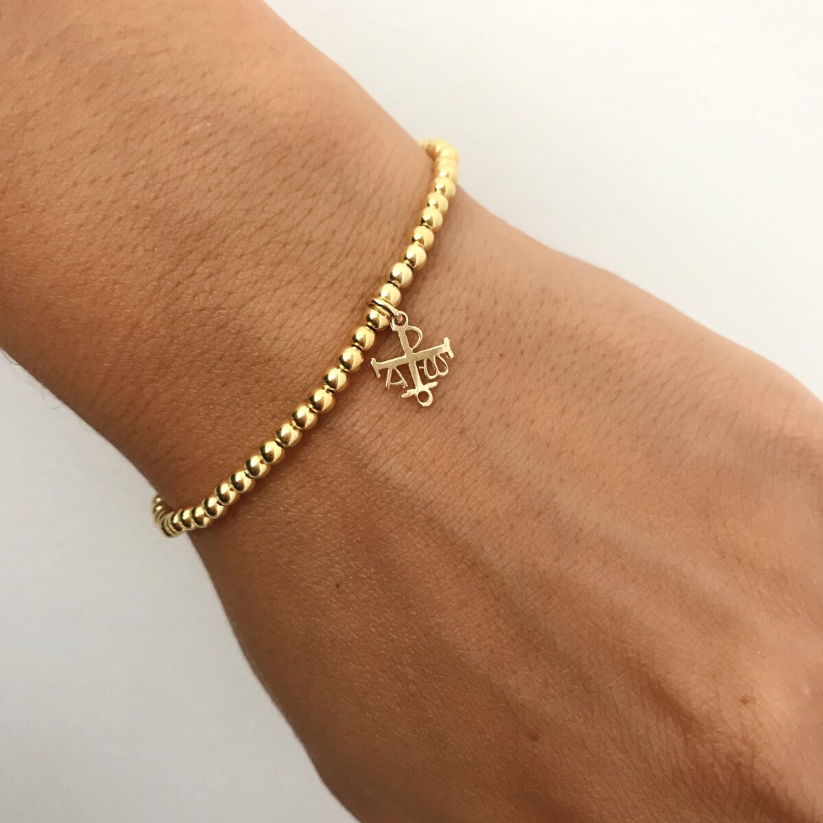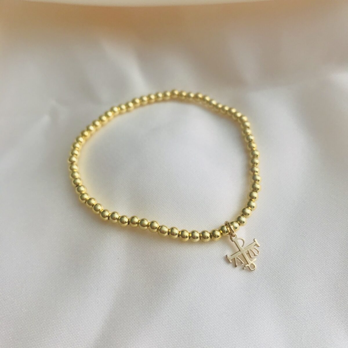 Pulsera Crismón Dorada realizada en plata de Primera Ley 925 bañada en oro de 18 quilates. Nuestra pieza es única y va montada a mano con un hilo transparante especial y elástico ajustable a tu muñeca.