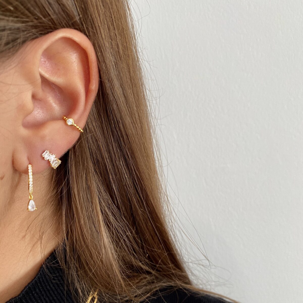 Earcuff Prai, con un diseño exclusivo en plata de Primera Ley 925chapada en oro 18k con bolitas y circonita central. Una elección para sentirte especial y única con todos tus looks