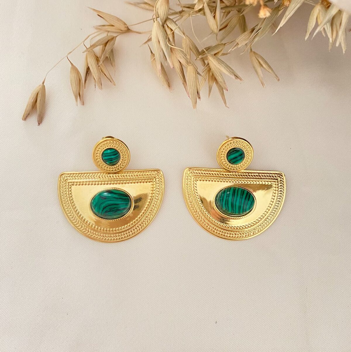 Pendientes Lola Malaquita. Pendientes en forma de aro con un diseño exclusivo realizado en acero bañado en oro de 18K.