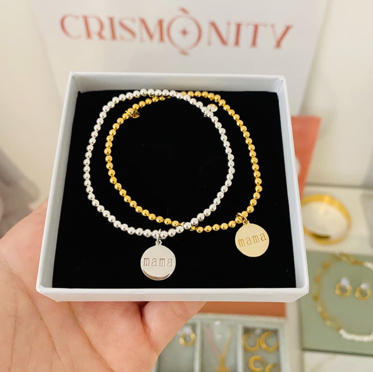 Pulsera Bolitas Mama, realizada en Plata de Primera Ley 925 y Plata chapada en oro de 18K. Medida elástica ajustable.
