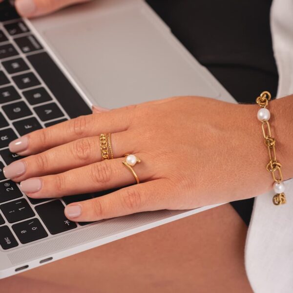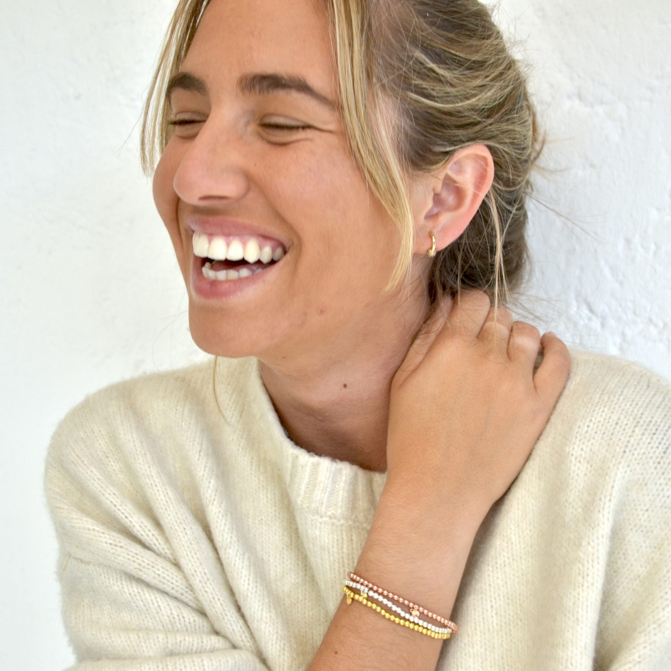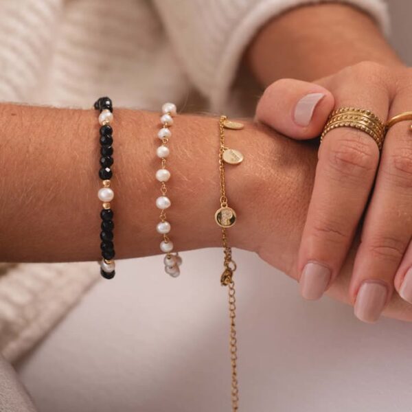 Pulsera Bolitas Crismonity, disponible en 3 colores y realizada en plata de primera Ley 925, plata bañadas en oro de 18 quilates y oro rosa. Talla única con goma especial ajustable